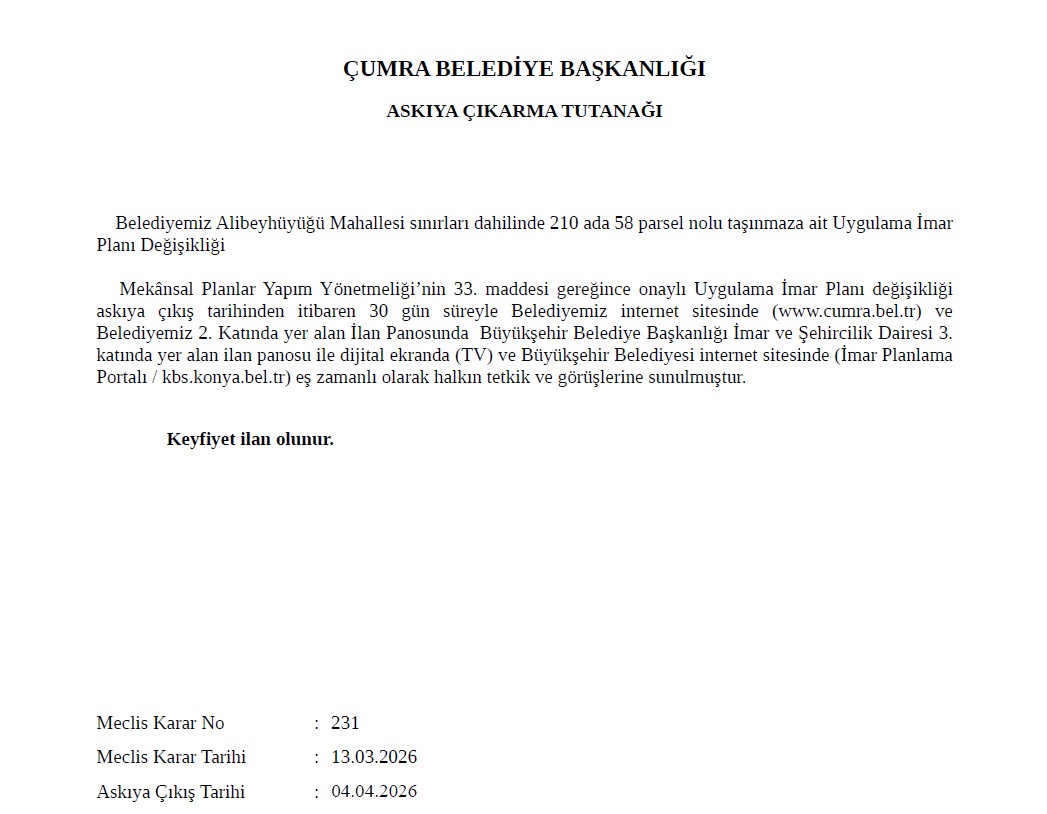 Belediyemiz Alibeyhüyüğü Mahallesi sınırları dahilinde 210 ada 58 parsel nolu taşınmaza ait Uygulama İmar Planı Değişikliği