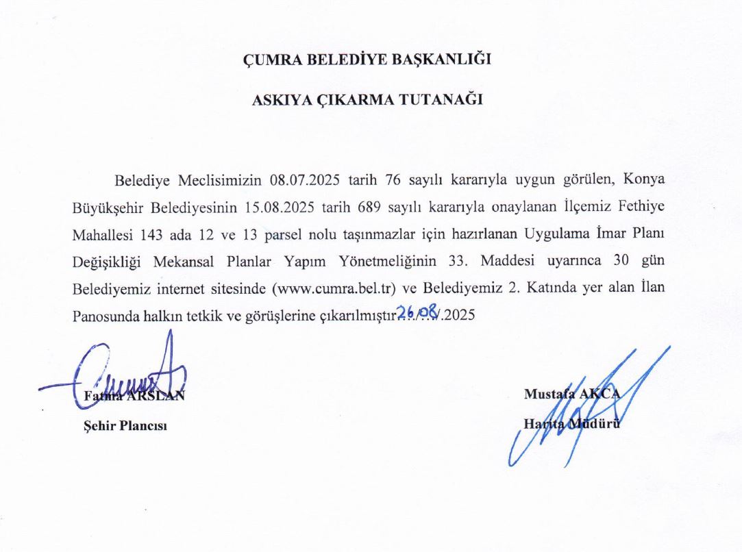 Fethiye Mahallesi 143 Ada 12 ve 13 Parsel Nolu Taşınmazlar İçin Hazırlanan Uygulama İmar Plan Değişikliği